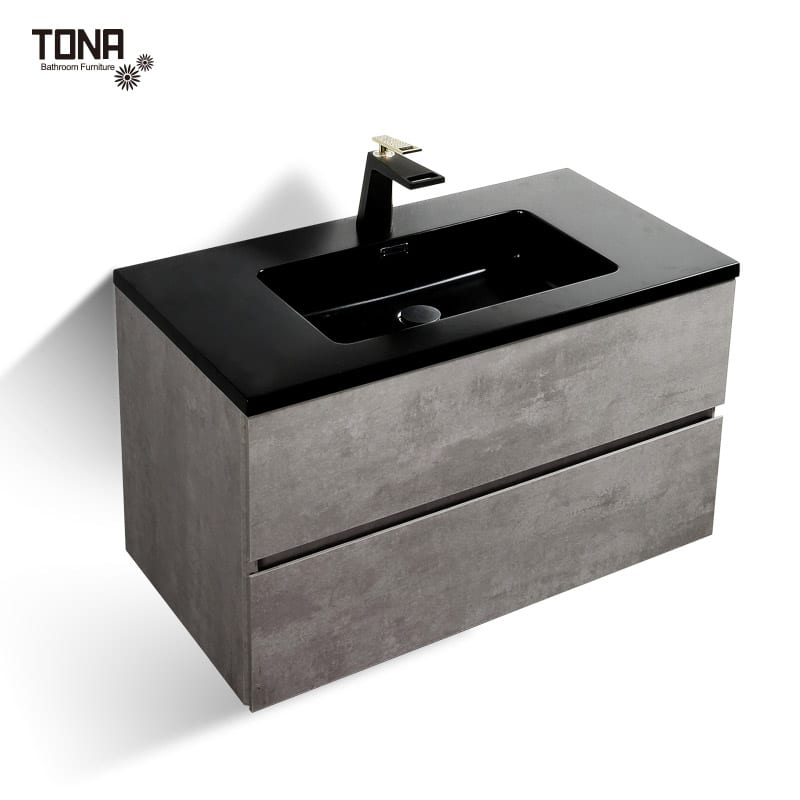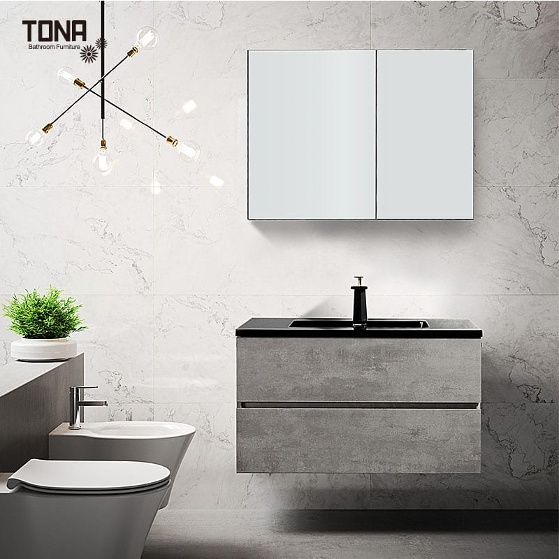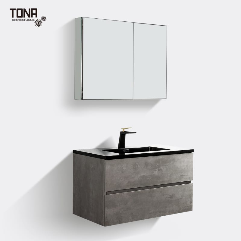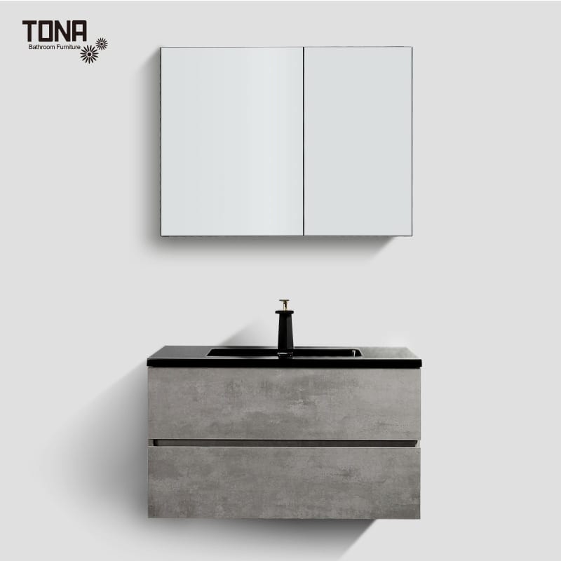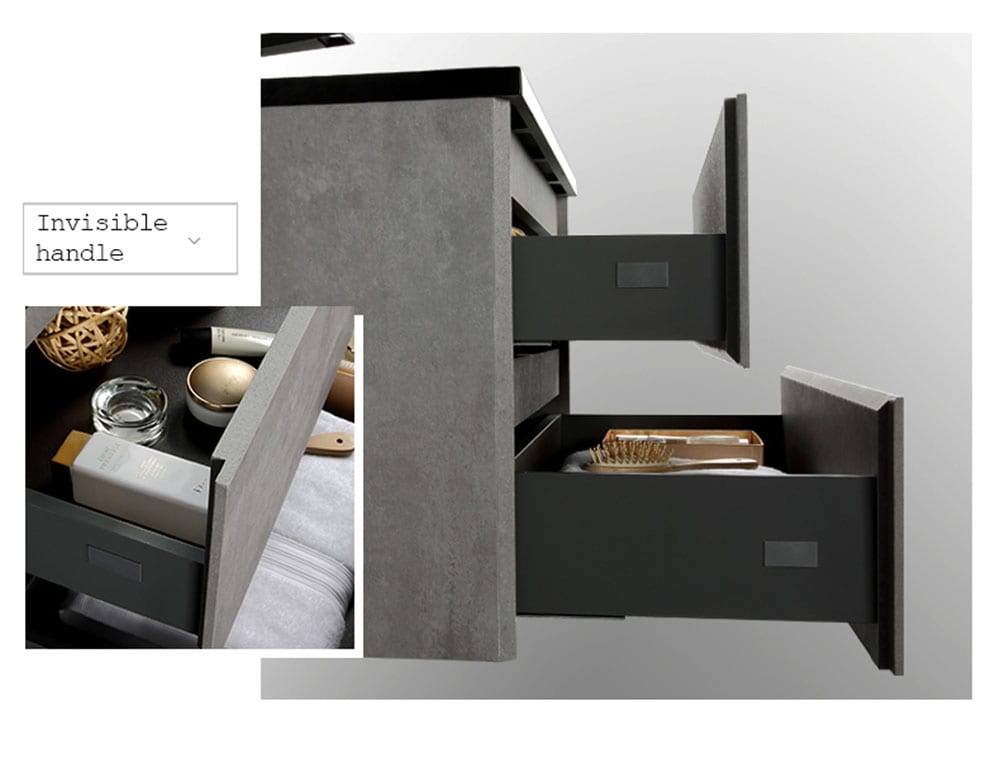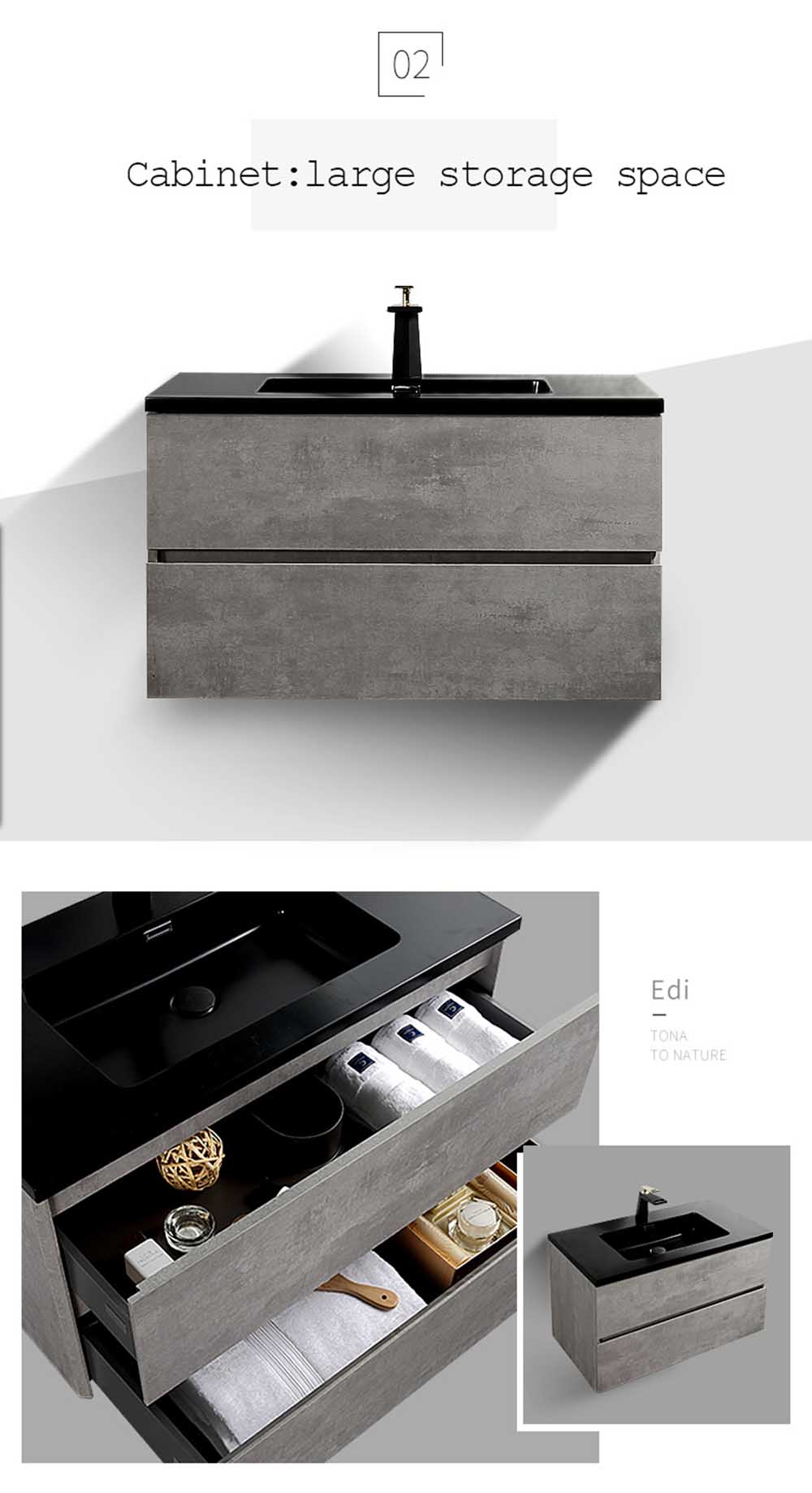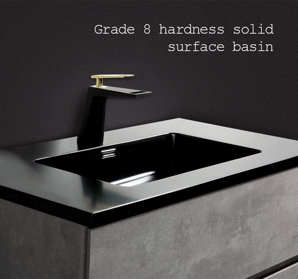 Elevate the style in your bathroom with this ashen concrete-inspired 2-drawer bathroom vanity to claim the coveted modern industrial vibes. Features a black solid surface top and integrated basin that is easy to maintain and durable, perfectly complementing the concrete aesthetics. Comes with a modish mirror cabinet with intelligent LED environment lighting and touch switch.