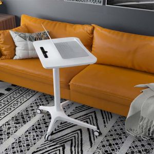 This is a versatile laptop side table perfect by your sofa or bed. This height adjustable table can be fixed at any height between 75-105 cm, allowing you to optimise its height when you are working. Comes with a slot for your mobile phone or iPad. The table top can be tilted to suit your preference. Mounted on one leg to appear visually light and designed with castors.