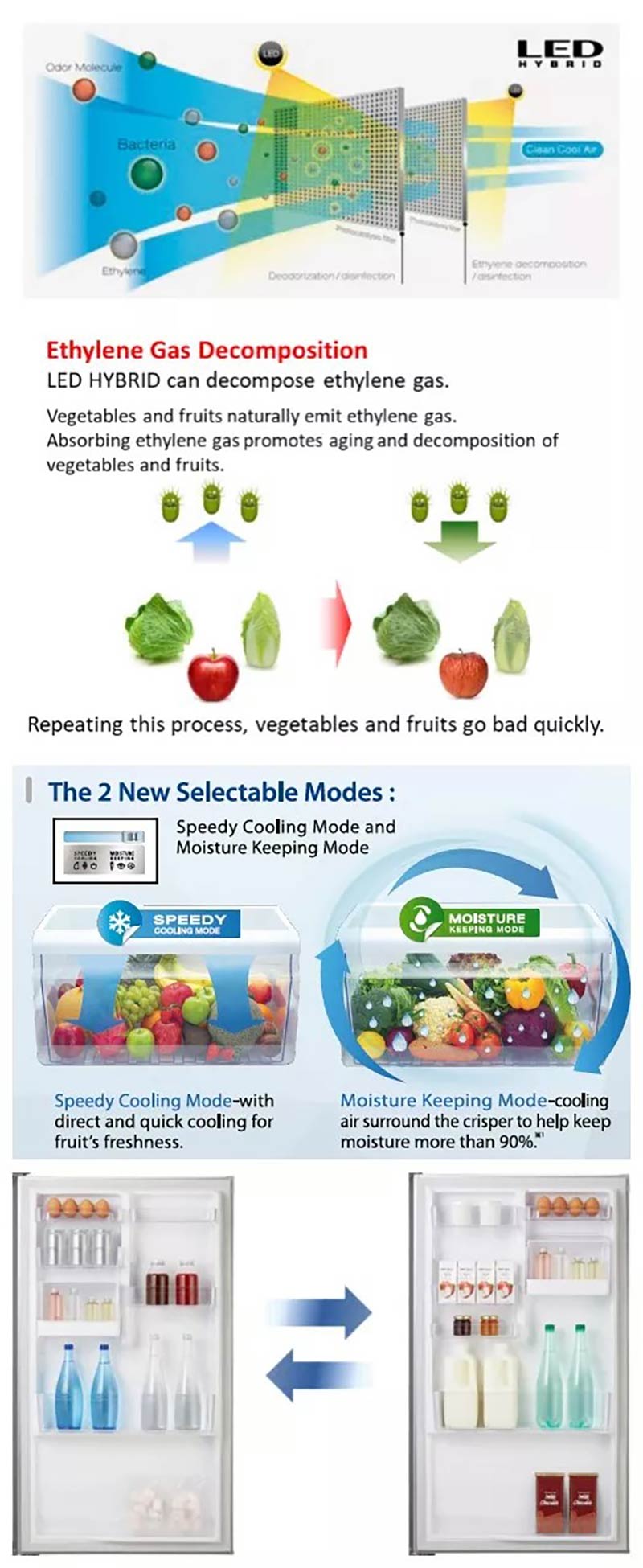 Beverages cool faster and can be stored in a larger space. Also suitable for storing raw items like fish and meat. A large capacity of 53 litres enables ample space for fruits and vegetables to be stored, for the whole family. Direct and quick cooling keeps fruits fresh and crisp. Cool air surrounds in order to maintain the moisture level at more than 90%. As a result, vegetables remain fresher. The new LED HYBRID effectively eliminates bacteria in the refrigerator with the use of LED light. At the same time unpleasant odor molecules are disintegrated, keeping the air in the refrigerator clean and fresh. Your food also last longer and fresher as ethylene gas which is produced naturally by some fruits and vegetables are decomposed with the presence of LED HYBRID. Ethylene is a gas that accelerates softening, discoloration and deterioration of food.