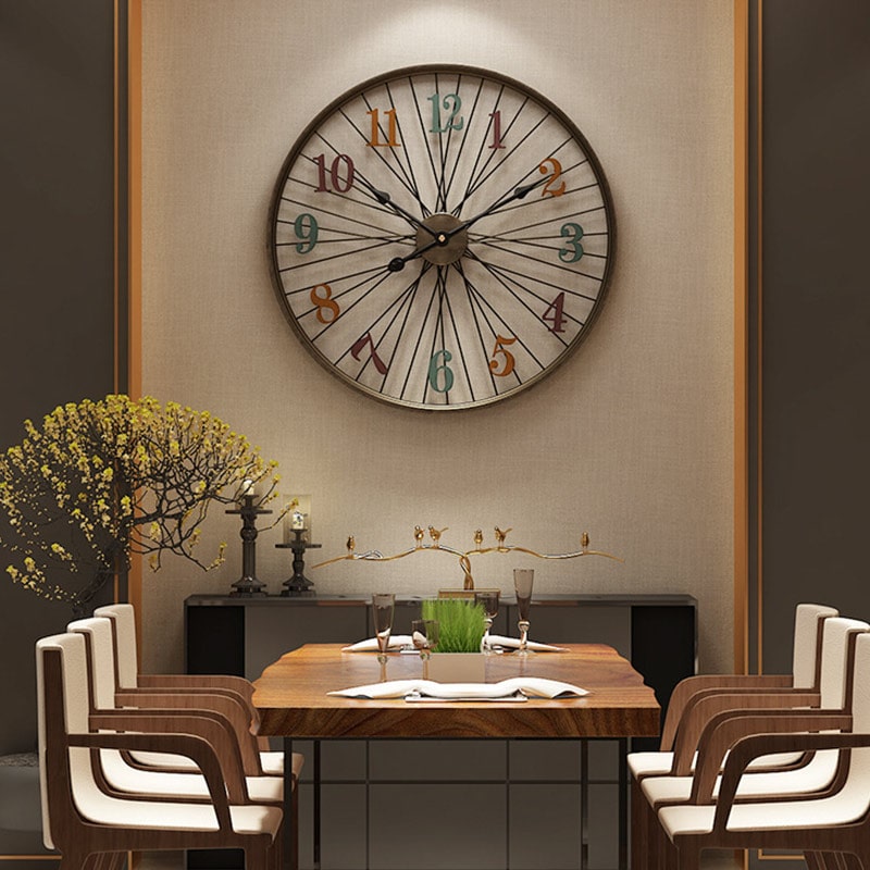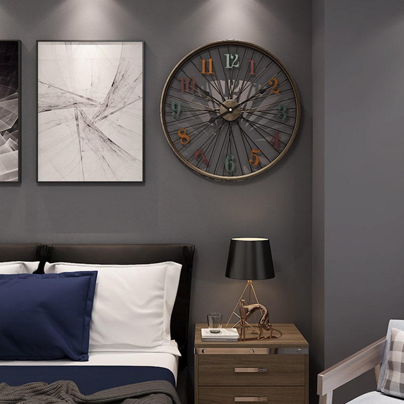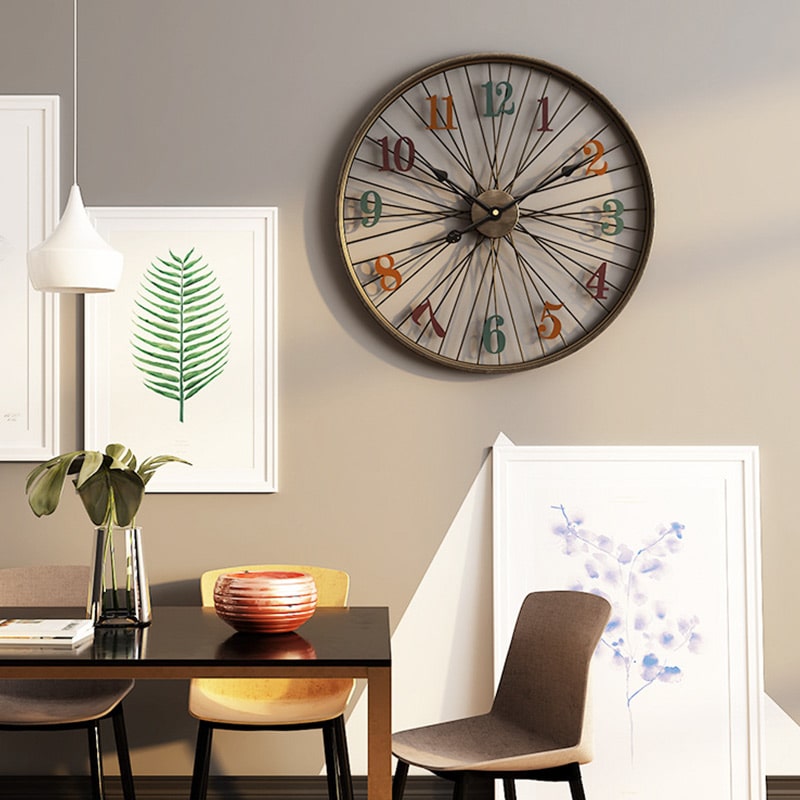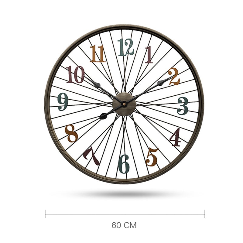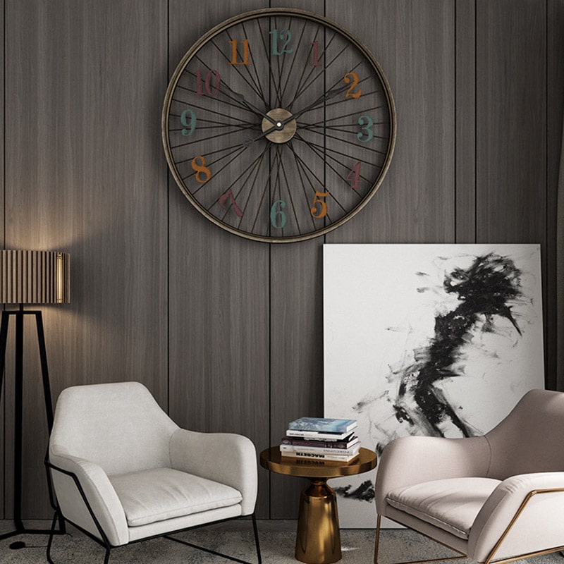 This industrial-accented clock possesses a distressed appeal, bringing to mind an upcycled bicycle wheel with its many stokes. Crafted out of iron, this eye-catching ensemble charms with is vintage industrial look, perfect as a single accent on a wall or wall-mounted with frames and art collection to make a statement.