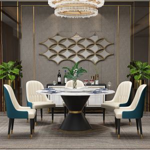 This is a modern classic dining table featuring a quality rock slab table top with marble-like veins with sleek tapered legs. Rock slab mimics natural stones but is more durable and resistant. Adds instant elegance to your dining room setup.