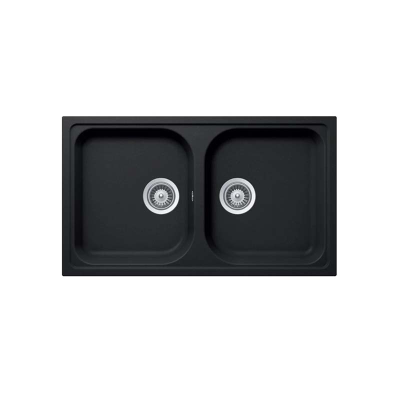 This black granite double sink spots a minimalist design with a rectangular shape to integrate seamlessly into modern, functional kitchens. Comes with 2-year warranty.