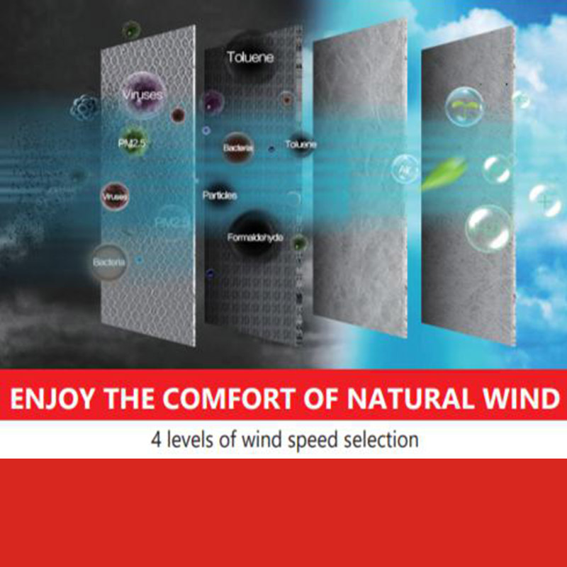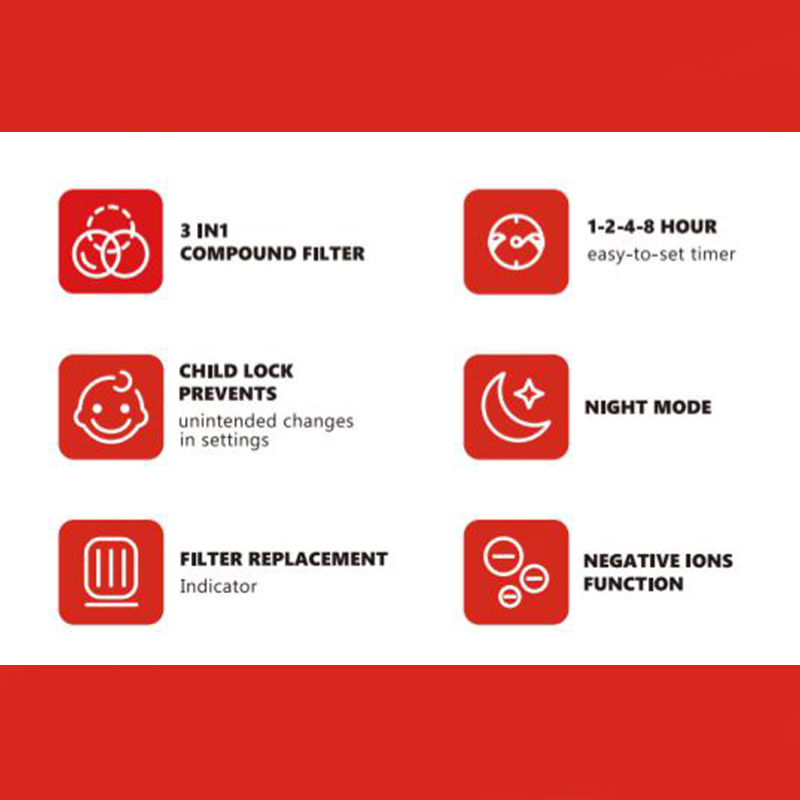 Up to 24m square coverage, Negative Ions Function, 4 manual settings, turbo speed, 1,2,4,8, hours easy to set timer, Lower speed & noise level (26.3db - 50.4db) in Sleep mode, Child lock prevents uninteded changes in settings, 3-in-1 compound filter
